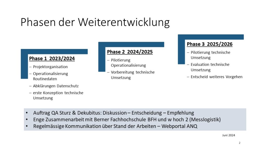 - Phase 2 (2024/2025): Pilotierung Operationalisierung, Vorbereitung technische Umsetzung.Die Arbeiten befinden sich aktuell in dieser zweiten Phase. Für Herbst 2024 ist ein Online-Dialog geplant, um die zuständigen Personen in den Spitälern und Kliniken über die vorgesehene Messmethode zu informieren. Die Pilotmessungen sind für das erste Quartal 2025 terminiert. Im Vorfeld wird der ANQ ent-sprechende Schulungen anbieten.