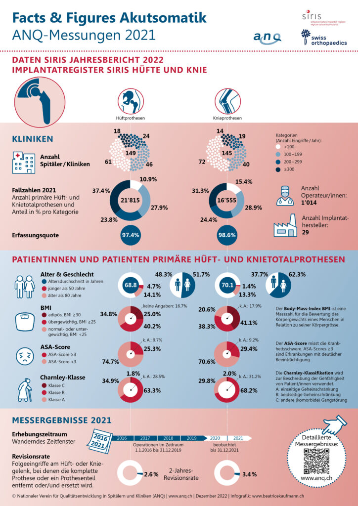 Für die Fachwelt sind die sogenannten 2-Jahres-Revisionsraten, die heute im SIRIS Report 2022 und auf dem ANQ-Webportal veröffentlicht wurden, von besonderer Bedeutung. Die Raten weisen den Anteil an Folgeoperationen (Revisionen) innerhalb von zwei Jahren nach der ersten Implantation aus und geben Ärzteschaft, Fachgesellschaft und Prothesenherstellern wichtige Hinweise auf die Qualität der Implantate und der chirurgischen Eingriffe.