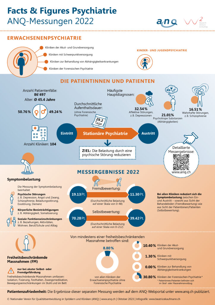 Die Auswertungen basieren auf Daten von 86’497 Patientinnen und Patienten aus 104 Kliniken der Erwachsenenpsychiatrie und von 4’950 Kindern und Jugendlichen aus 30 Kliniken der Kinder- und Jugendpsychiatrie. Die Zahl der Fälle stieg somit das zweite Jahr in Folge deutlich an. Welche Gründe für den Anstieg verantwortlich sein könnten, wurde im Rahmen der ANQ-Messungen nicht untersucht. Die Qualität der von den Kliniken erfassten Daten war erneut sehr gut.