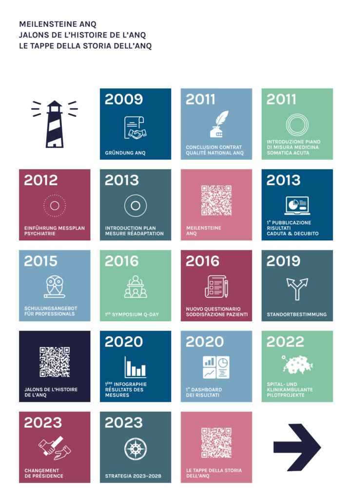 En organisant le Q-Day, l’ANQ encourage l’échange d’expériences, le transfert de connaissances et la mise en réseau entre les hôpitaux et les cliniques. Organisé chaque année jusqu’en 2018, il s’est depuis établi à un rythme bisannuel. En janvier 2022, l’ANQ organise le premier Q-Day entièrement virtuel. En 2024, le symposium se tiendra à nouveau en présentiel à Berne.