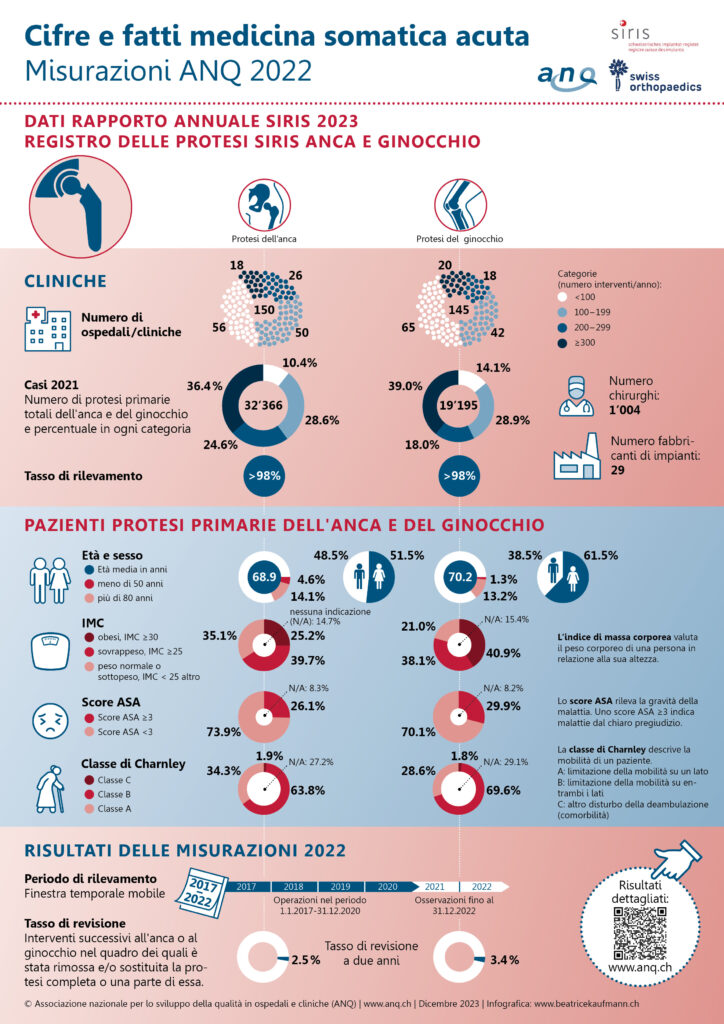 Dal 2012, le cliniche e gli ospedali svizzeri hanno documentato nel Registro delle protesi SIRIS anca e ginocchio quasi 407’300 protesi primarie dell’anca e del ginocchio, nonché circa 18’800 interventi successivi. Il nuovo incremento del tasso di rilevamento – nel 2022 è stato registrato il 98% circa di tutti gli impianti – consente di effettuare svariate analisi con un elevato grado di rappresentatività. La Fondazione SIRIS e l’Associazione nazionale per lo sviluppo della qualità in ospedali e cliniche (ANQ) hanno pubblicato oggi le ultime analisi svolte dall’Università di Berna, le quali forniscono a medici, associazioni specialistiche e fabbricanti di protesi importanti indicazioni per migliorare costantemente la qualità dell’implantologia protesica.